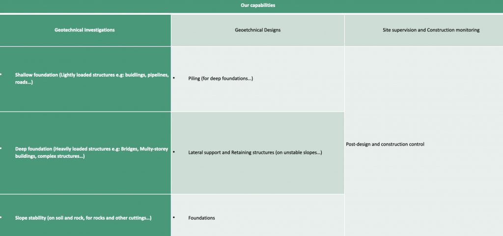Our engineers and technical partners have extensive experience in specialized geotechnical applications through work with private and public clients in DRC, South Africa and neighboring african countries.